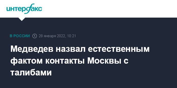 Москва. 28 января. INTERFAX.RU - Зампредседателя Совбеза Дмитрий Медведев назвал естественным факт наличия контактов руководства России с талибами (движение "Талибан" признано в России террористическим и запрещено). Он сказал об этом в интервью нескольким СМИ, в том числе "Интерфаксу".