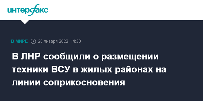 Москва. 28 января. INTERFAX.RU - Народная милиция самопровозглашенной Луганской народной республики продолжает фиксировать размещение военной техники Вооруженных сил Украины в жилых районах, сообщил представитель военного ведомства ЛНР Иван Филипоненко.