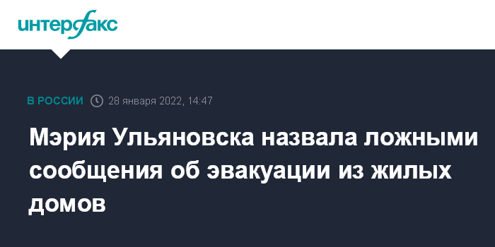 Москва. 28 января. INTERFAX.RU - Распространяемая среди населения информация о якобы запланированных тренировочных эвакуациях в Ульяновске не соответствует действительности, сообщает мэрия города в пятницу.
