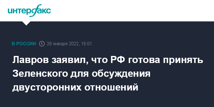 Москва. 28 января. INTERFAX.RU - Россия готова принять президента Украины Владимира Зеленского, если он хочет обсудить двусторонние отношения, но не Донбасс, сообщил глава МИД РФ Сергей Лавров.