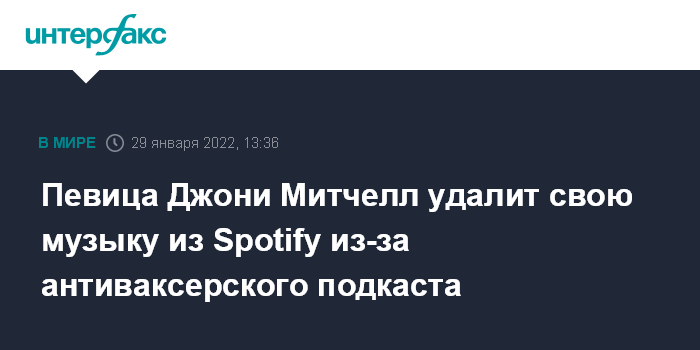 Москва. 29 января. INTERFAX.RU - Канадская певица Джони Митчелл попросила удалить ее музыку с платформы Spotify из-за дезинформации о COVID-19, распространявшейся в одном из подкастов. Об этом сообщается на сайте BBC News.