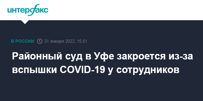 Москва. 31 января. INTERFAX.RU - В Уфе Кировский районный суд предупредил, что не будет работать с 1 по 9 февраля из-за массового заражения сотрудников суда коронавирусом.