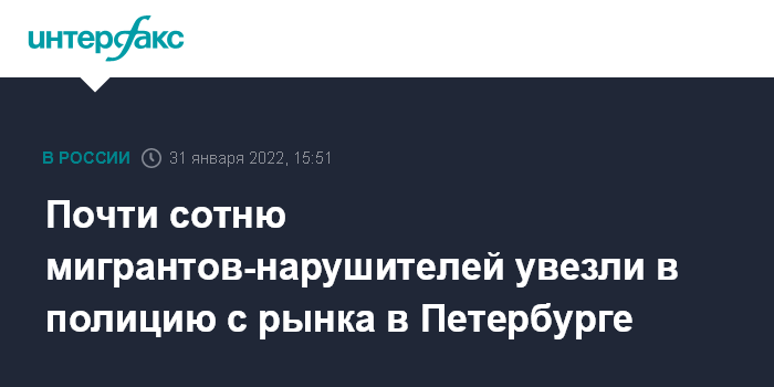 Москва. 31 января. INTERFAX.RU - Свыше 60 иностранцев, нарушивших российское миграционное законодательство, выявила полиция по итогу рейда на Софийской овощебазе в Петербурге, сообщает в понедельник пресс-служба регионального главка МВД.