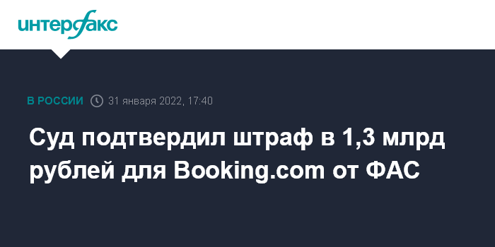 Москва. 31 января. INTERFAX.RU - Девятый арбитражный апелляционный суд оставил в силе решение Арбитражного суда Москвы, который 24 ноября 2021 года признал законность штрафа в 1,3 млрд рублей, который ФАС назначила сервису онлайн-бронирования мест в отелях Booking.com.