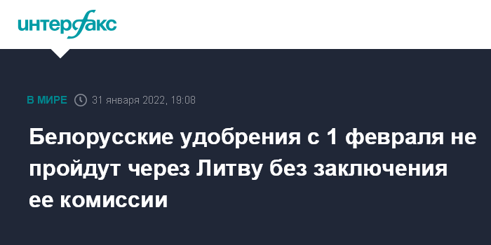 Москва. 31 января. INTERFAX.RU - В понедельник, 31 января, завершается транзит через Литву удобрений одного из крупнейших в мире производителей и экспортеров калийных удобрений "Беларуськалий", ни одна заявка на транспортировку в феврале не подтверждена, сообщает компания LTG (Lietuvos gelezinkeliai, Литовские железные дороги).