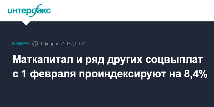 Москва. 1 февраля. INTERFAX.RU - С 1 февраля 2022 года в РФ вступает в силу решение правительства об индексации на 8,4% материнского капитала, выплат ветеранам, единовременного пособия при рождении ребенка и еще нескольких социальных выплат, кроме того неработающие пенсионеры начнут получать проиндексированную на 8,6% пенсию.