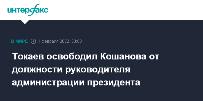 Москва. 1 февраля. INTERFAX.RU - Президент Казахстана Касым-Жомарт Токаев подписал указ об освобождении Ерлана Кошанова от должности руководителя администрации президента страны, сообщила пресс-служба главы государства.