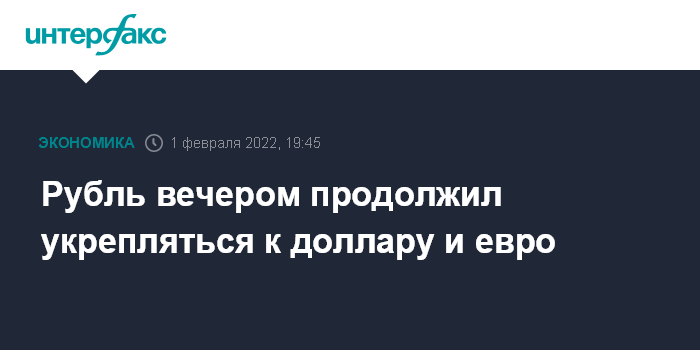 Как отмечают эксперты "Интерфакс-ЦЭА", рубль уверенно растет к доллару и евро на вечерних торгах на фоне укрепления надежд инвесторов на скорое урегулирование кризиса вокруг Украины. Во вторник состоялся телефонный разговор главы МИД РФ Сергея Лаврова с госсекретарем США Энтони Блинкеном, согласно сообщениям российского МИДа, их главной темой должна была стать российская реакция на ответ США на предложения РФ по гарантиям безопасности. После телефонного разговора Сергей Лавров прокомментировал ситуацию в видеообращении, распространенном МИД РФ.