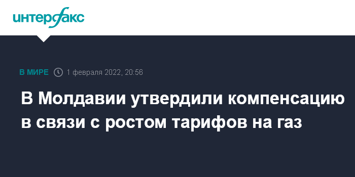 Москва. 1 февраля. INTERFAX.RU - Правительство Молдавии утвердило пакет компенсаций физическим и юридическим лицам в связи с новым ростом тарифов на газ.