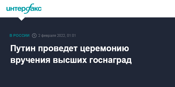 Москва. 2 февраля. INTERFAX.RU - Президент России Владимир Путин проведет в среду в Кремле церемонию вручения высших государственных наград, которыми отмечен труд более 20 выдающихся российских деятелей науки, медицины, авиации, искусства, бизнеса, а также ряда других областей, сообщила пресс-служба Кремля.