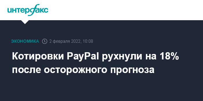 Москва. 2 февраля. INTERFAX.RU - Отчет платежной системы PayPal Holdings в целом оправдала ожидания рынка по прибыли и выручке в четвертом квартале 2021 года, однако осторожный прогноз компании смутил инвесторов, и ее акции подешевели почти на 18%.