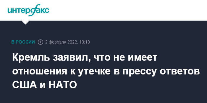 Москва. 2 февраля. INTERFAX.RU - Москва не имеет отношения к публикации ответов США и НАТО на российские предложения по гарантиям безопасности, материал в Кремле не комментируют, заявил журналистам пресс-секретарь президента РФ Дмитрий Песков.