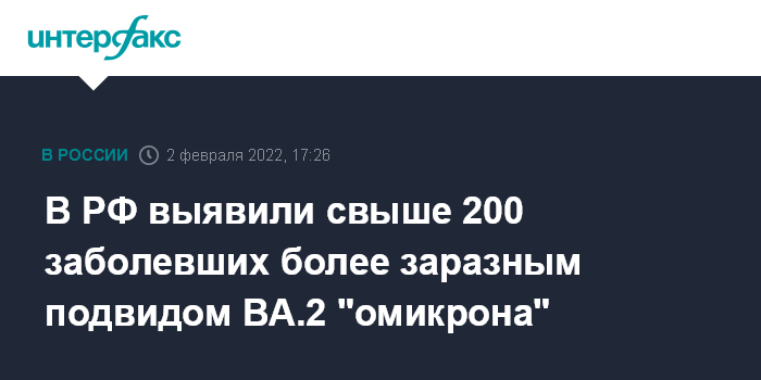 Москва. 2 февраля. INTERFAX.RU - В РФ зарегистрированы случаи заболевания линией BA.2 "омикрон"-штамма коронавируса, которая считается более заразной, чем распространенный вариант, сообщила глава Роспотребнадзора Анна Попова.