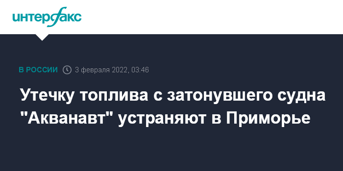 Москва. 3 февраля. INTERFAX.RU - Разлив топлива с затонувшего судна "Акванавт" устраняют в порту Зарубино, сообщил "Интерфаксу" директор приморского филиала Морспасслужбы Росморречфлота Иван Агаревский.