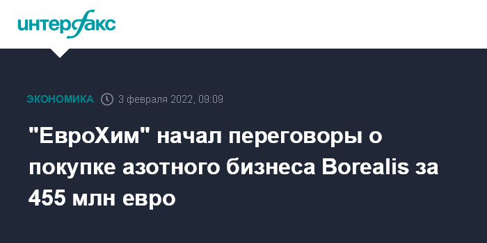 Москва. 3 февраля. INTERFAX.RU - "ЕвроХим" Андрея Мельниченко сообщил, что начал эксклюзивные переговоры о покупке азотного бизнеса у группы Borealis (контролируется австрийской нефтегазовой компанией OMV), сообщила компания.