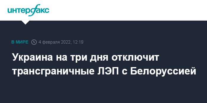 Москва. 4 февраля. INTERFAX.RU - Украина 24-26 февраля отключит трансграничные с Белоруссией линии электропередачи, но это не окажет негативного влияния на белорусскую энергосистему, заявляет белорусское Минэнерго.