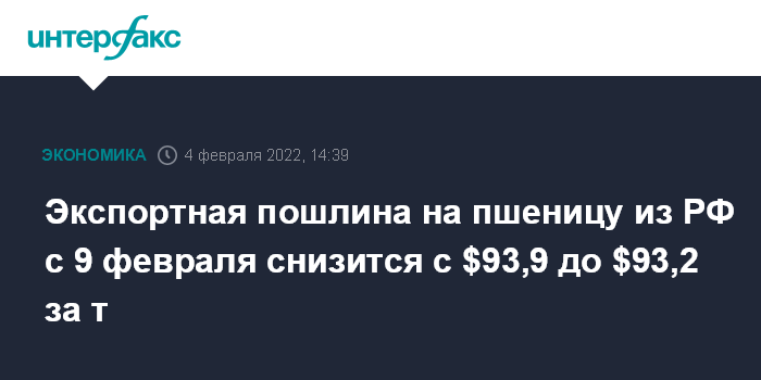 Москва. 4 февраля. INTERFAX.RU - Экспортная пошлина на пшеницу из РФ с 9 февраля снизится до $93,2 с $93,9 за тонну, сообщил Минсельхоз. Снижение продолжается четвертую неделю подряд.