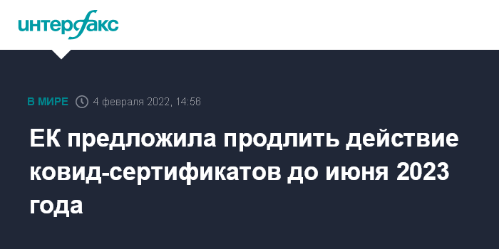 Москва. 4 февраля. INTERFAX.RU - Еврокомиссия предложила продлить действие системы ковид-сертификатов в ЕС на год, до 30 июня 2023 года, это позволит путешественникам продолжить использовать документ для поездок по странам-членам Евросоюза.