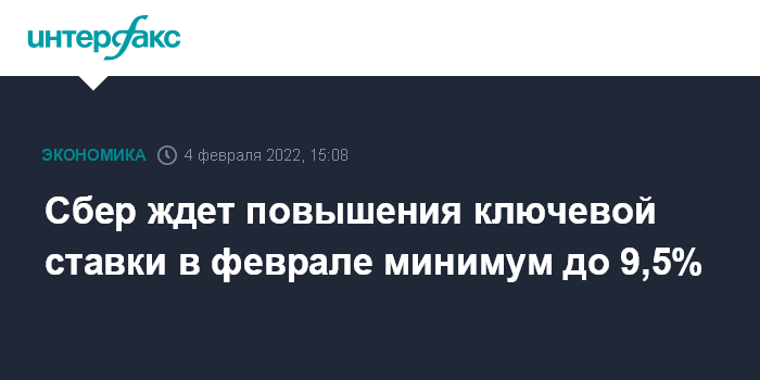 Москва. 4 февраля. INTERFAX.RU - Повышение ключевой ставки как минимум до 9,5% можно ожидать от Банка России 11 февраля, прогнозируют в Сбере.