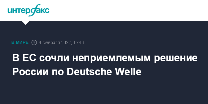 Москва. 4 февраля. INTERFAX.RU - В Брюсселе назвали неприемлемым решение России об аннулировании аккредитации всех сотрудников германской телерадиокомпании Deutsche Welle в РФ в качестве ответной меры на запрет вещания телеканала "RT DE" в Германии.