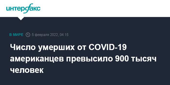 Москва. 5 февраля. INTERFAX.RU - Число жителей США, умерших от последствий коронавируса, превысило 900 тысяч человек. Об этом свидетельствуют данные университета Джонса Хопкинса.