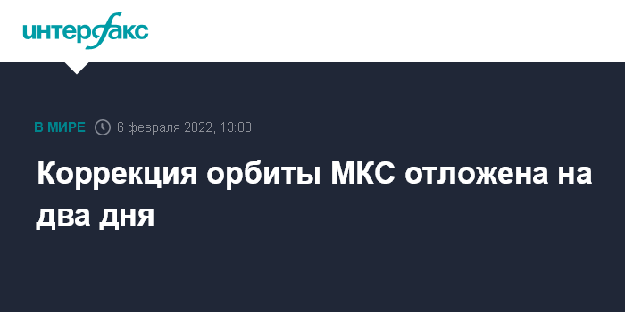 Москва. 6 февраля. INTERFAX.RU - Запланированная на 6 февраля коррекция высоты орбиты Международной космической станции перенесена на 8 февраля по баллистическим условиям, сообщили в "Роскосмосе".
