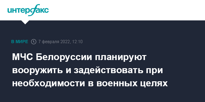 Москва. 7 февраля. INTERFAX.RU - Часть сотрудников МЧС Белоруссии могут вооружить на случай военных действий. Этот вопрос обсуждается на совещании у президента Александра Лукашенко по совершенствованию структуры МЧС в понедельник в Минске.