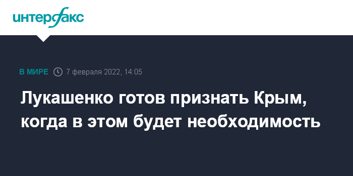 Москва. 7 февраля. INTERFAX.RU - Президент Белоруссии Александр Лукашенко заявил, что признает российскую принадлежность Крыма, а также Абхазию и Южную Осетию, как только поймет, что в этом есть необходимость.