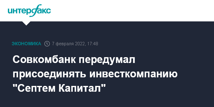Москва. 7 февраля. INTERFAX.RU - Совкомбанк передумал присоединять инвестиционную компанию "Септем капитал", и, напротив, перестал быть ее владельцем.