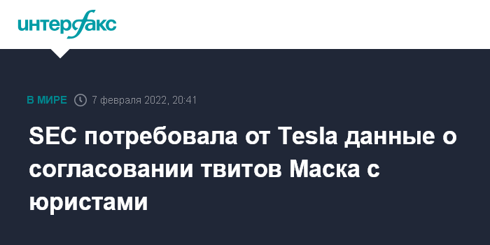 Москва. 7 февраля. INTERFAX.RU - Комиссия по ценным бумагам и биржам (SEC) США потребовала от Tesla Inc. информацию о том, каким образом исполняются условия соглашения, по которым твиты Илоны Маска должны предварительно согласовываться с юристами.