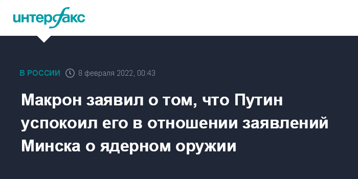 Москва. 8 февраля. INTERFAX.RU - Президент Франции Эммануэль Макрон сообщил, что президент РФ Владимир Путин развеял его обеспокоенность, связанную с заявлениями белорусского лидера Александра Лукашенко о ядерном оружии.