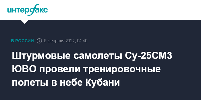 Москва. 8 февраля. INTERFAX.RU - Экипажи штурмового авиационного полка Южного военного округа, дислоцированного в Краснодарском крае, отработали сложные элементы пилотажа - вертикальные, горизонтальные и косые "бочки", боевые развороты и петлю "Нестерова" на штурмовиках Су-25СМ3, сообщает пресс-служба ЮВО.
