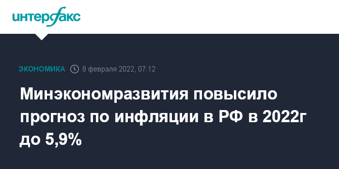 Москва. 8 февраля. INTERFAX.RU - Минэкономразвития повысило прогноз по инфляции на 2022 год с 4,0% до 5,9%, обновленная оценка передана в правительство РФ, сообщила во вторник газета "Ведомости" со ссылкой на федерального чиновника.