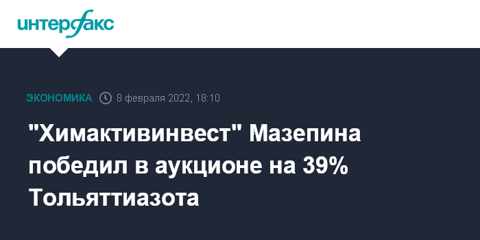 Москва. 8 февраля. INTERFAX.RU - АО "Химактивинвест" (Москва, подконтрольно структуре Дмитрия Мазепина) стало победителем аукциона на покупку 38,74% обыкновенных акций ПАО "Тольяттиазот", говорится в протоколе торгов.