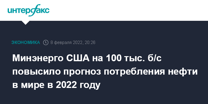 Москва. 8 февраля. INTERFAX.RU - Потребление нефти и жидких углеводородов (ЖУВ) в мире в 2022 году составит 100,6 млн баррелей в сутки, что на 3,5 млн б/с больше, чем в 2021 году, говорится ежемесячном прогнозе управления энергетической информации Минэнерго США (EIA).
