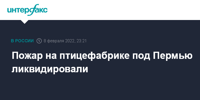 Москва. 8 февраля. INTERFAX.RU - Возгорание на птицефабрике "Комсомольская" (актив "Траста" в Пермском крае) ликвидировано, сообщили "Интерфаксу" в пресс-службе регионального управления МЧС во вторник.