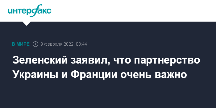 Москва. 9 февраля. INTERFAX.RU - Президент Владимир Зеленский заявил, что у Украины и Франции общее видение актуальных угроз и вызовов, стоящих перед Европой и миром в целом, и позитивно оценил визит своего французского коллеги Эммануэля Макрона.