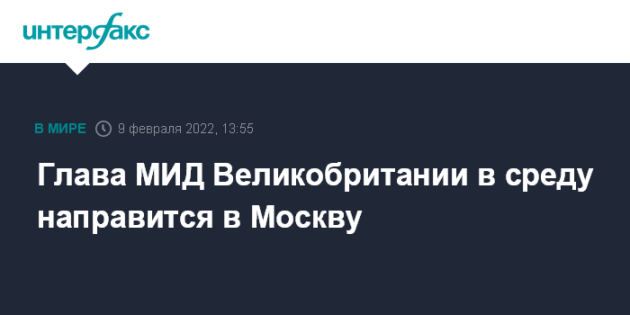 Москва. 9 февраля. INTERFAX.RU - Глава МИД Великобритании Лиз Трасс в среду отправляется с двухдневным визитом в Москву, в ходе которого обсудит с министром иностранных дел РФ Сергеем Лавровым ситуацию вокруг Украины, сообщает британское внешнеполитическое ведомство.