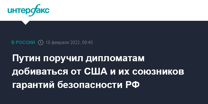 Москва. 10 февраля. INTERFAX.RU - Президент РФ Владимир Путин поздравил сотрудников и ветеранов МИД с профессиональным праздником и поставил перед дипломатами задачу добиваться получения от США и их союзников юридически закрепленных гарантий безопасности России, сообщила в четверг пресс-служба Кремля.