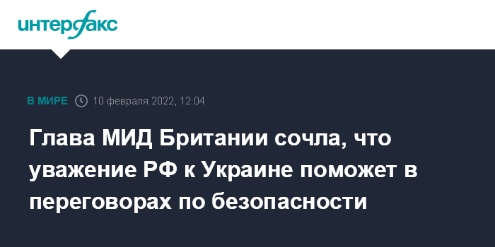 Москва. 10 февраля. INTERFAX.RU - При уважении принципа территориальной целостности и суверенитета Украины на переговорах с Россией по укреплению безопасности будет достигнут прогресс, заявила глава МИД Великобритании Лиз Трасс.
