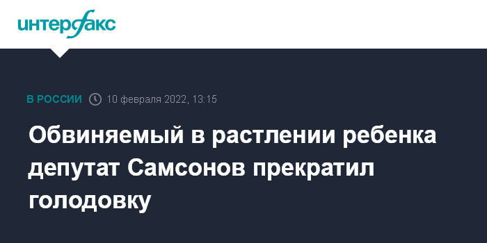 Москва. 10 февраля. INTERFAX.RU - Депутат Законодательного собрания Приморского края от КПРФ Артем Самсонов, арестованный по обвинению в растлении ребенка, заявил о прекращении голодовки, объявленной месяц назад в знак протеста против отказа следствия в исследовании независимым полиграфологом и невозможности участвовать в заседаниях краевого законодательного собрания по видеоконференцсвязи.