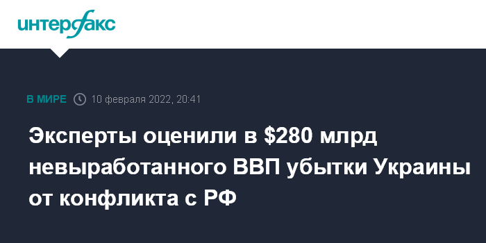 Москва. 10 февраля. INTERFAX.RU - Конфликт с Россией, начиная с 2014 года, ежегодно стоил Украине 19,9% ее ВВП доконфликтного уровня, общие убытки составили $280 млрд невыработанного ВВП в 2014-2020 годах.