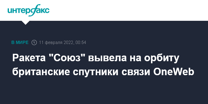 Москва. 11 февраля. INTERFAX.RU - Партия из 34 спутников связи британской компании OneWeb успешно отделилась от разгонного блока "Фрегат" после старта ракеты "Союз-СТ-Б" с космодрома Куру во Французской Гвиане, сообщили в "Роскосмосе".