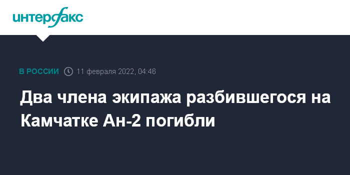 Москва. 11 февраля. INTERFAX.RU - По предварительной информации, при крушении Ан-2 на Камчатке погибли два члена экипажа, сообщил в пятницу губернатор Камчатского края Владимир Солодов.