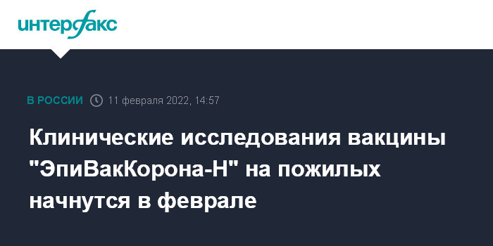 Москва. 11 февраля. INTERFAX.RU - Клинические исследования вакцины "ЭпиВакКорона-Н" научного центра "Вектор" Роспотребнадзора на людях старше 60 лет начнутся в феврале и продлятся 42 дня, наблюдение за добровольцами продолжится в течение шести месяцев после вакцинации, сообщили "Интерфаксу" в центре.