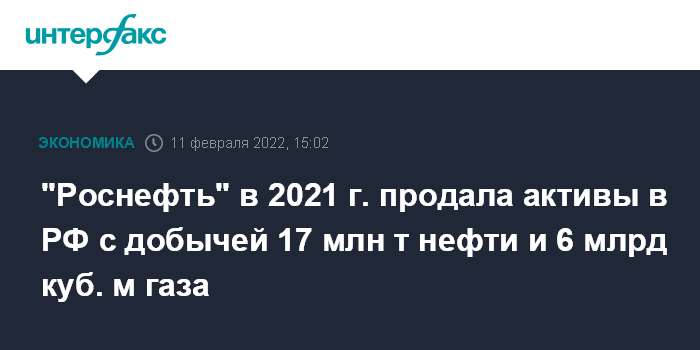 "Роснефть" в 2021 г. продала активы в РФ с добычей 17 млн т нефти и 6 млрд куб. м газа