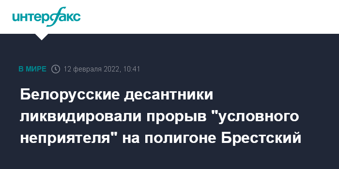 Москва. 12 февраля. INTERFAX.RU - Десантно-штурмовой батальон 38-й отдельной гвардейской десантно-штурмовой бригады Вооруженных сил Белоруссии на полигоне "Брестский" выполнил задачу по усилению охраны участка условной государственной границы в ходе белорусско-российских учений "Союзная решимость-2022", сообщили в субботу в пресс-службе министерства обороны Белоруссии.