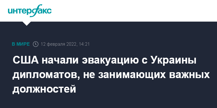Москва. 12 февраля. INTERFAX.RU - Государственный департамент США начинает эвакуацию американских дипломатов, работающих в Киеве, в связи с угрозой начала военных действий, сообщило посольство США на Украине в твиттере.