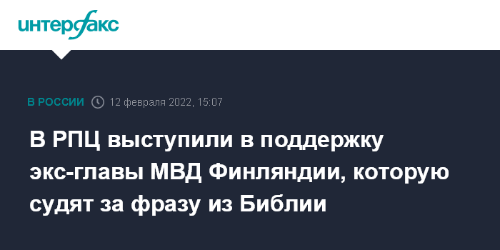Москва. 12 февраля. INTERFAX.RU - В Русской православной церкви заявили о поддержке бывшего министра внутренних дел Финляндии Пайви Расанен, которая предстала перед судом за пост в соцсетях, где процитировала фразу из Библии с негативной оценкой сексуальных меньшинств.