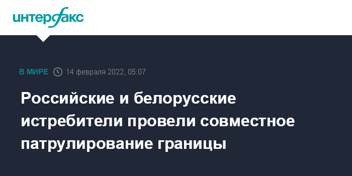 Москва. 14 февраля. INTERFAX.RU - Российские и белорусские истребители Су-30СМ провели совместное патрулирование границы в рамках учений "Союзная решимость-2022", сообщили в Минобороны РФ.